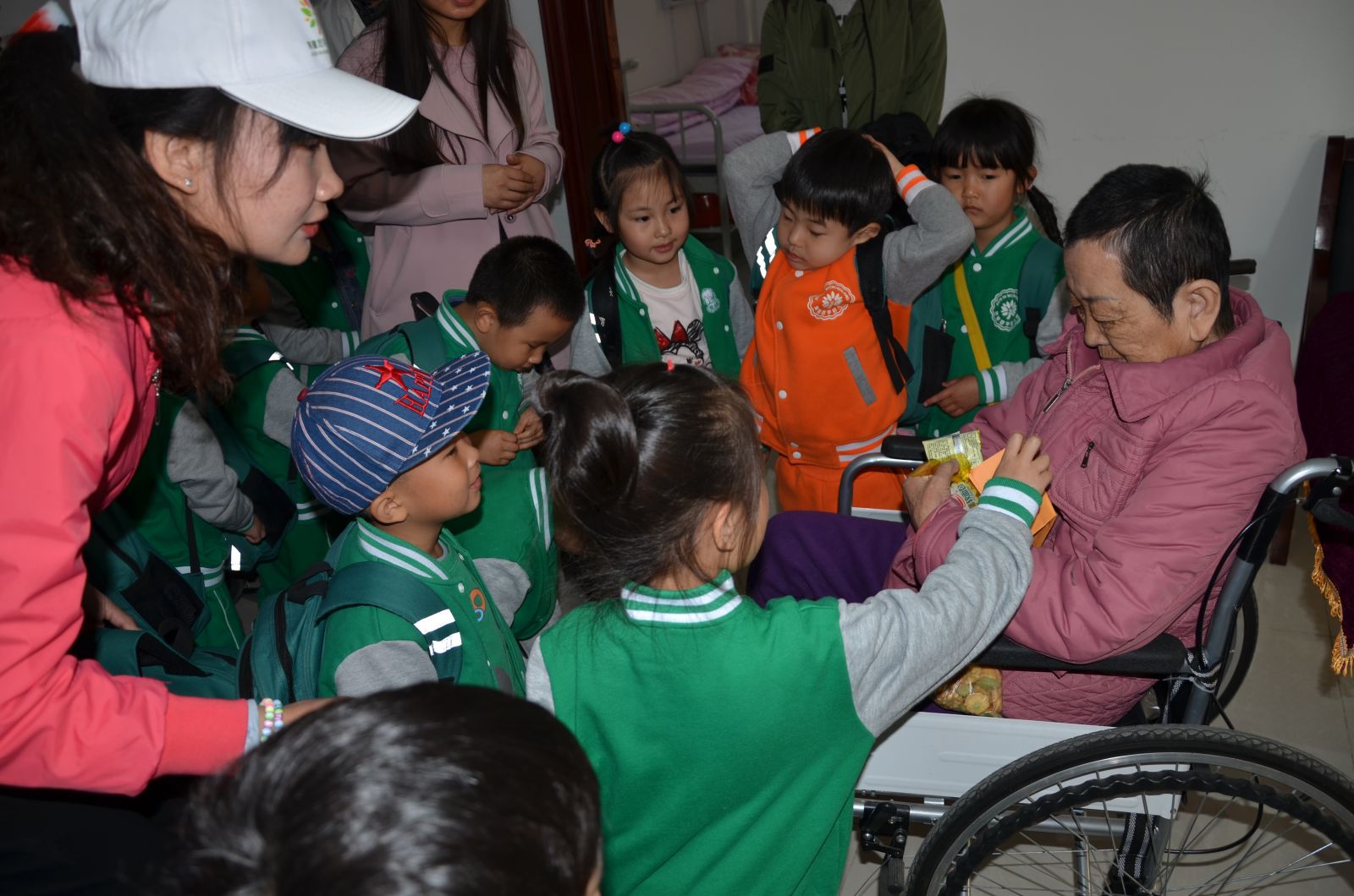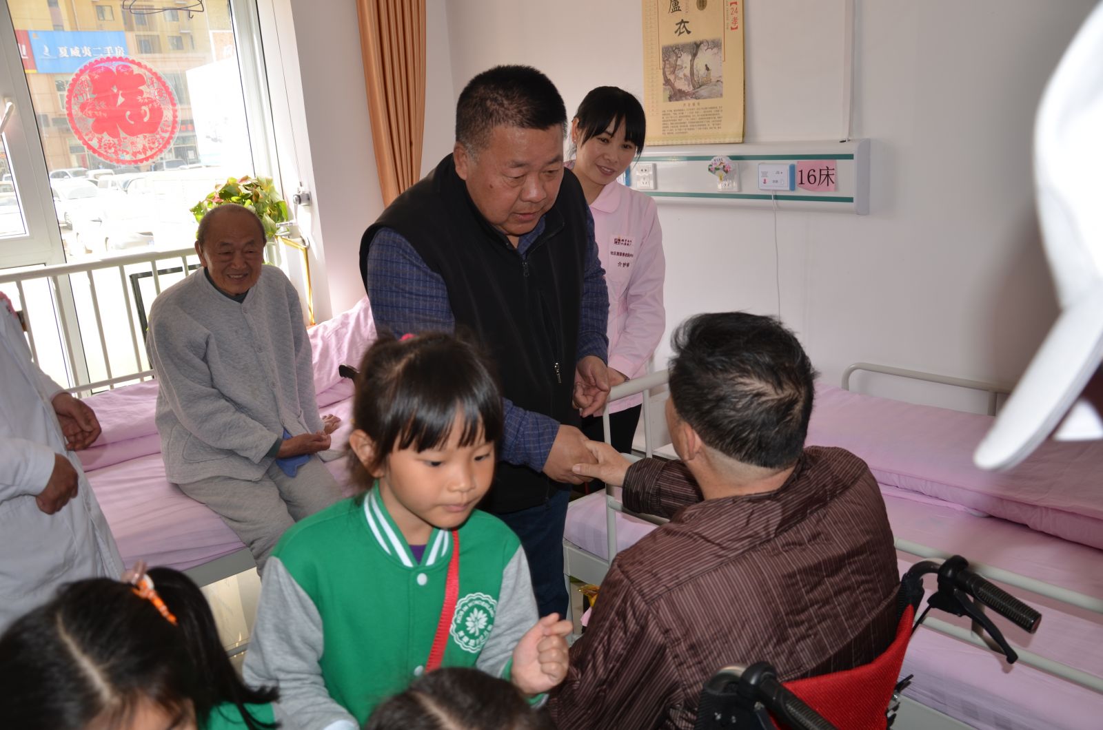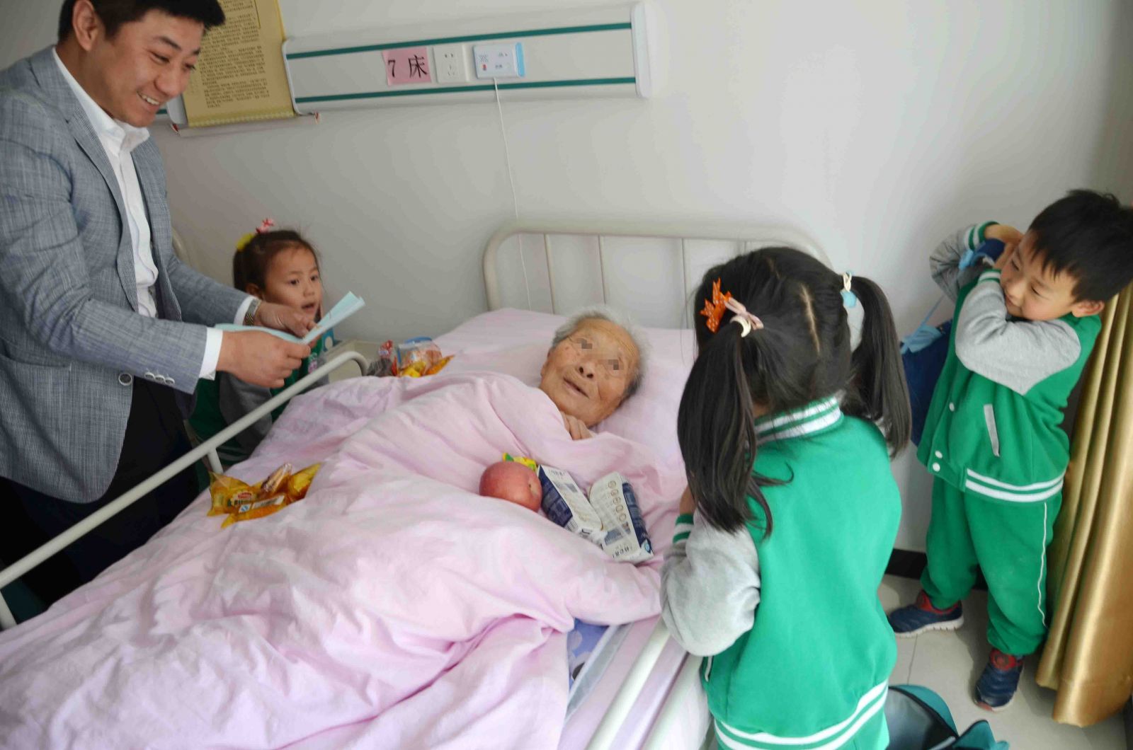 最后,在场所有的爱心人士,大朋友、小朋友们在工作人员的带领下,有序地到老人们的房间里进行爱心慰问。爱心人士曹叔叔特意带来了理发工具,亲自为这里的老人们剪头发,这一暖心的举动让服务中心所有人纷纷对曹叔叔竖起了大拇指;幼儿园的小宝宝们则是将自己在家里准备的水果、点心还有自己亲手画的简笔画,都亲手送到了爷爷奶奶们的手里,一声声稚嫩的“爷爷奶奶”让老人们倍感温馨,小宝宝们还为老人们送上了动听的歌曲,场面温馨至极。