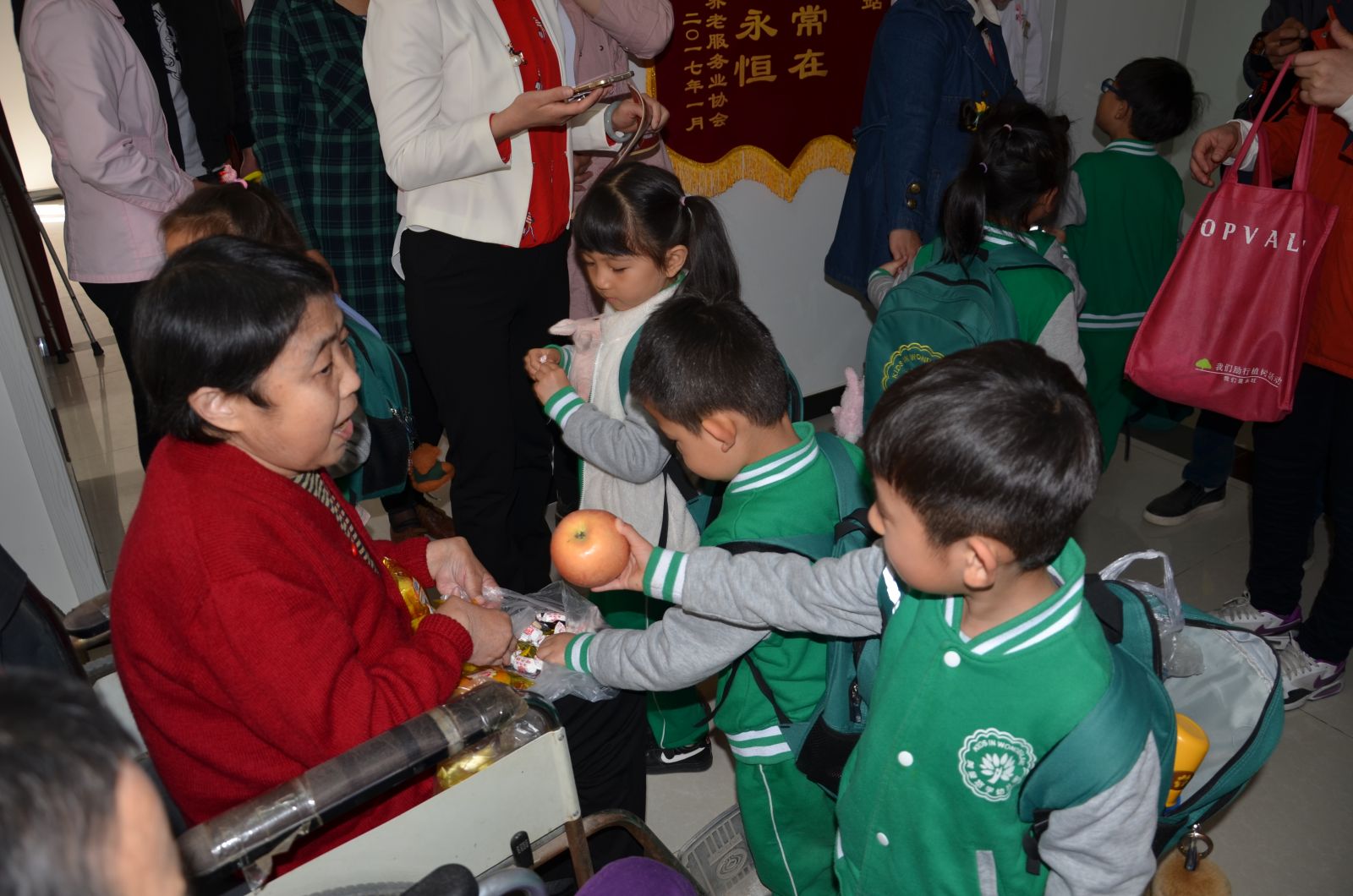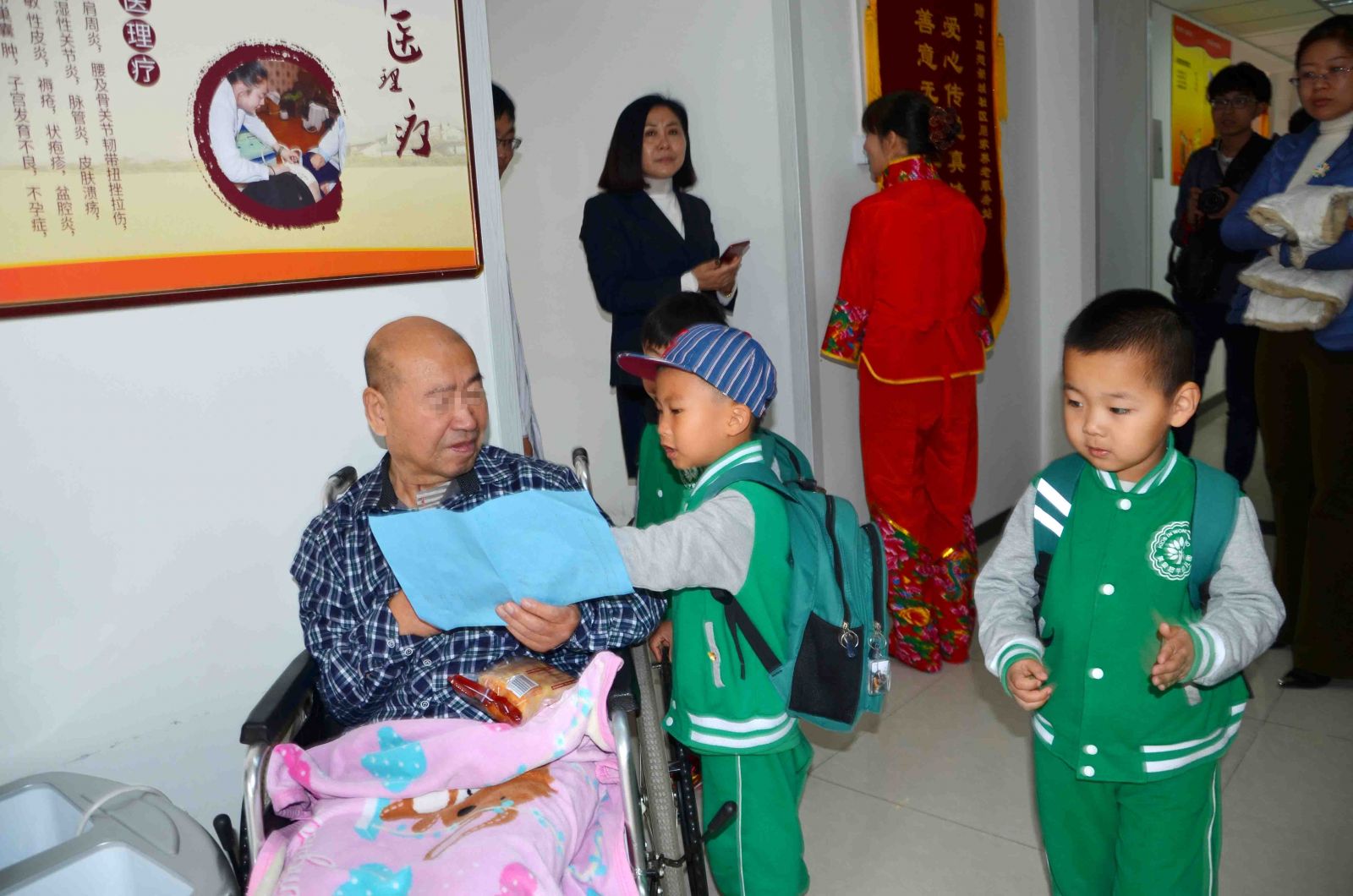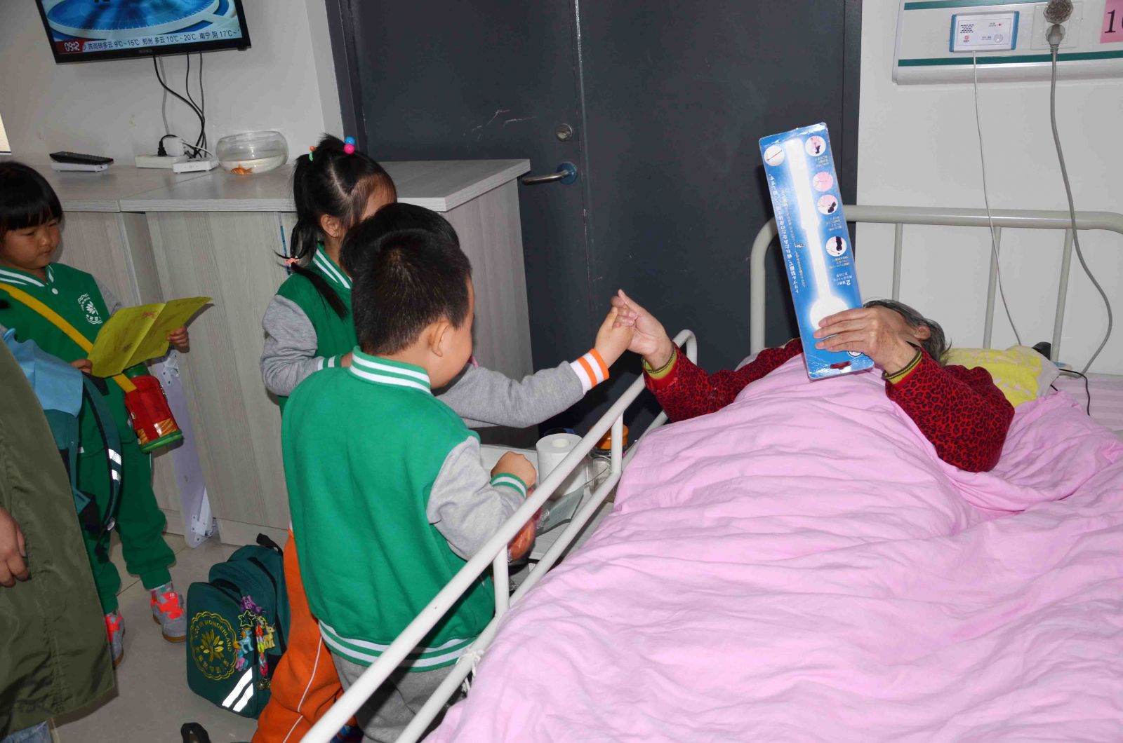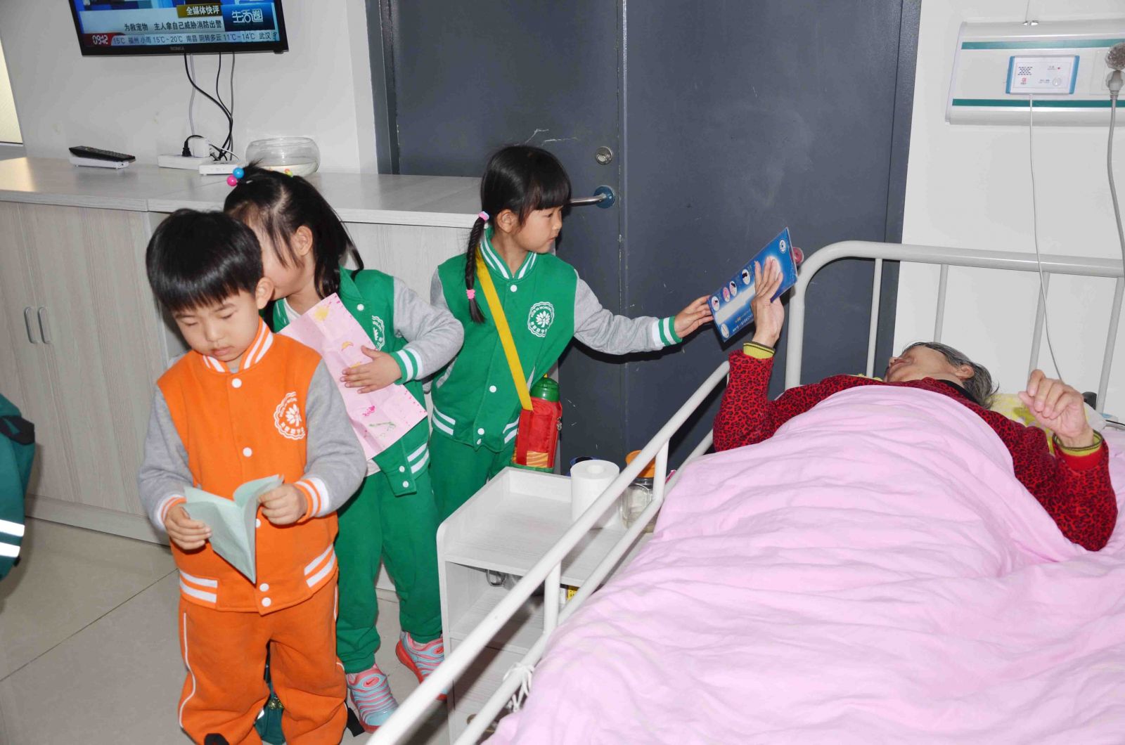 最后,在场所有的爱心人士,大朋友、小朋友们在工作人员的带领下,有序地到老人们的房间里进行爱心慰问。爱心人士曹叔叔特意带来了理发工具,亲自为这里的老人们剪头发,这一暖心的举动让服务中心所有人纷纷对曹叔叔竖起了大拇指;幼儿园的小宝宝们则是将自己在家里准备的水果、点心还有自己亲手画的简笔画,都亲手送到了爷爷奶奶们的手里,一声声稚嫩的“爷爷奶奶”让老人们倍感温馨,小宝宝们还为老人们送上了动听的歌曲,场面温馨至极。